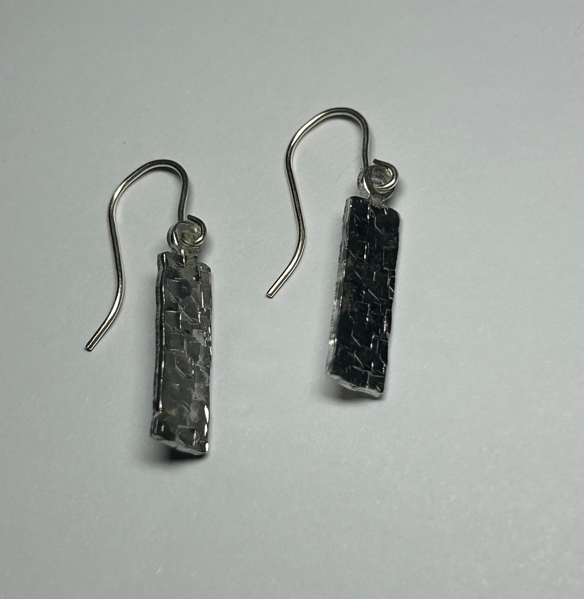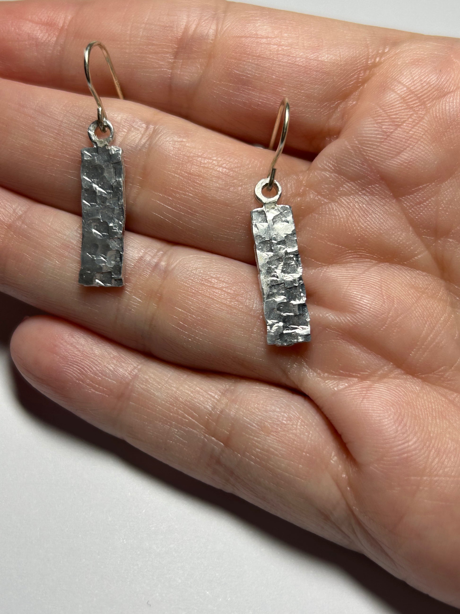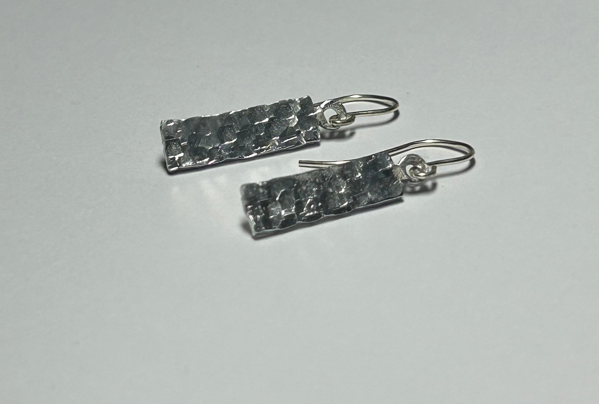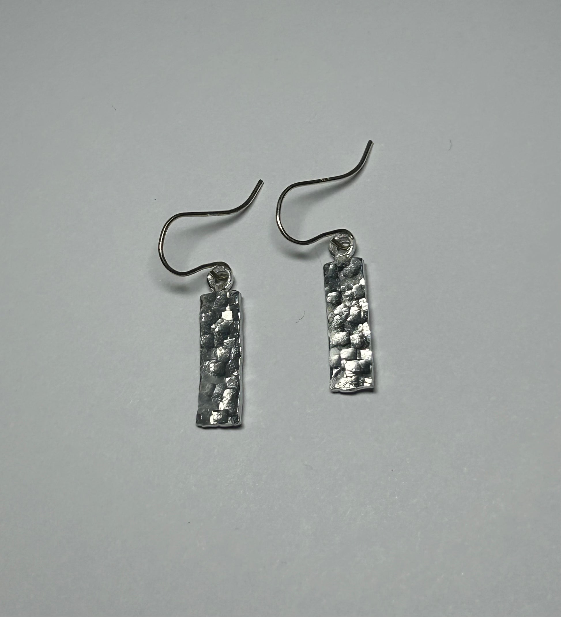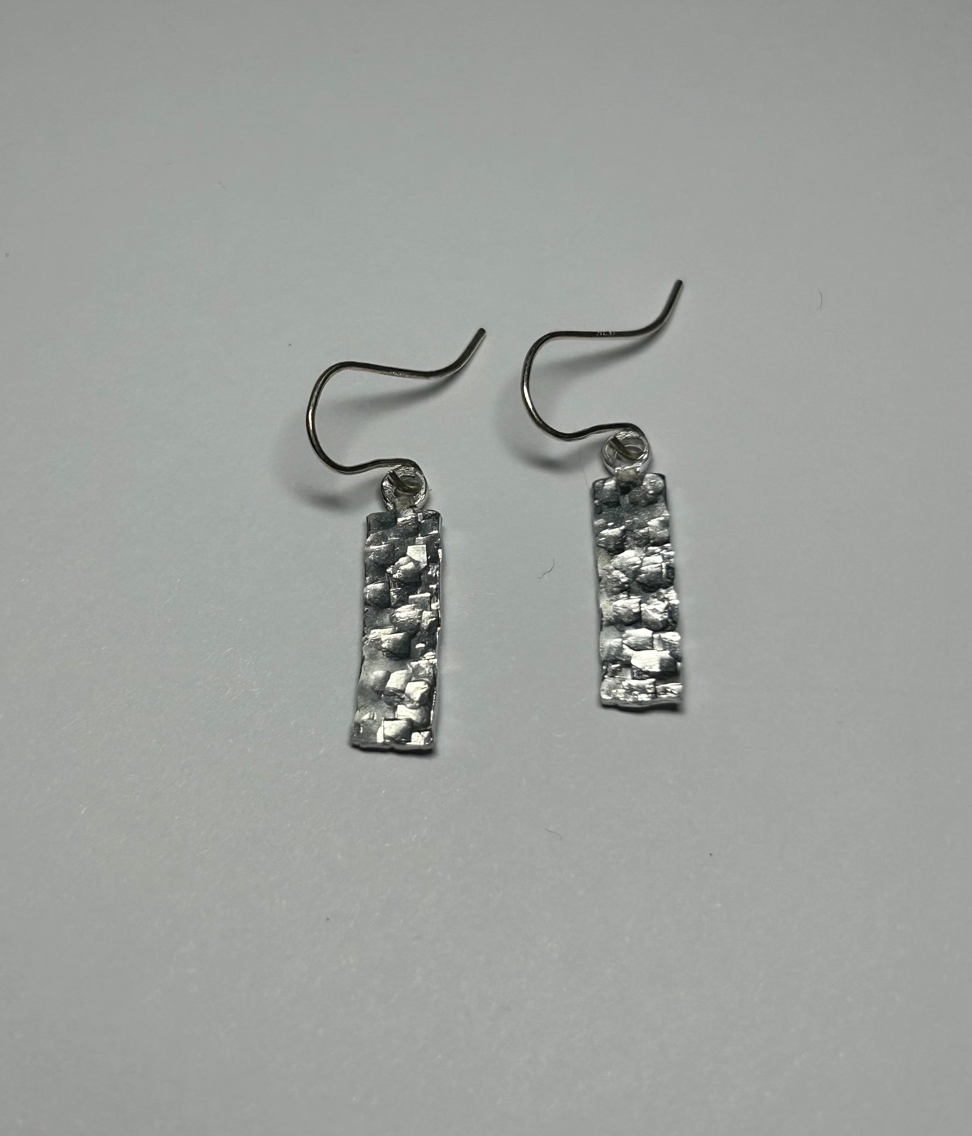 Add a touch of modern elegance to your look with these unique handcrafted earrings. Each pair features lightweight hammered aluminum rectangles, giving them a beautiful textured finish that catches the light from every angle. The simple yet striking design makes them versatile enough for everyday wear while still standing out as a statement piece.