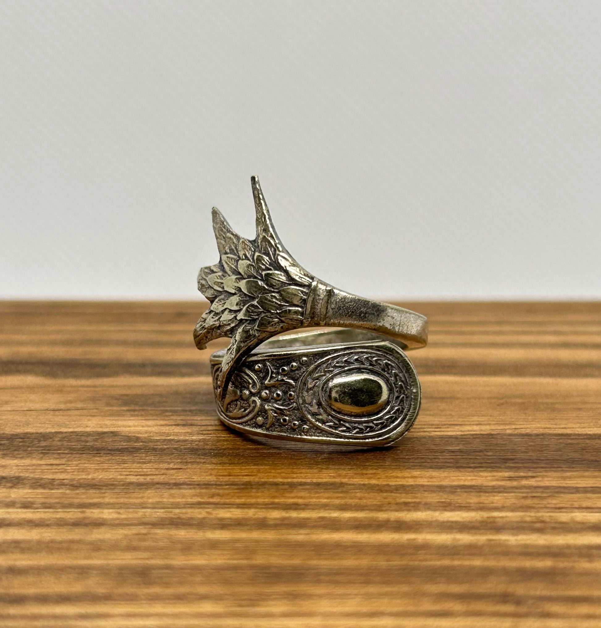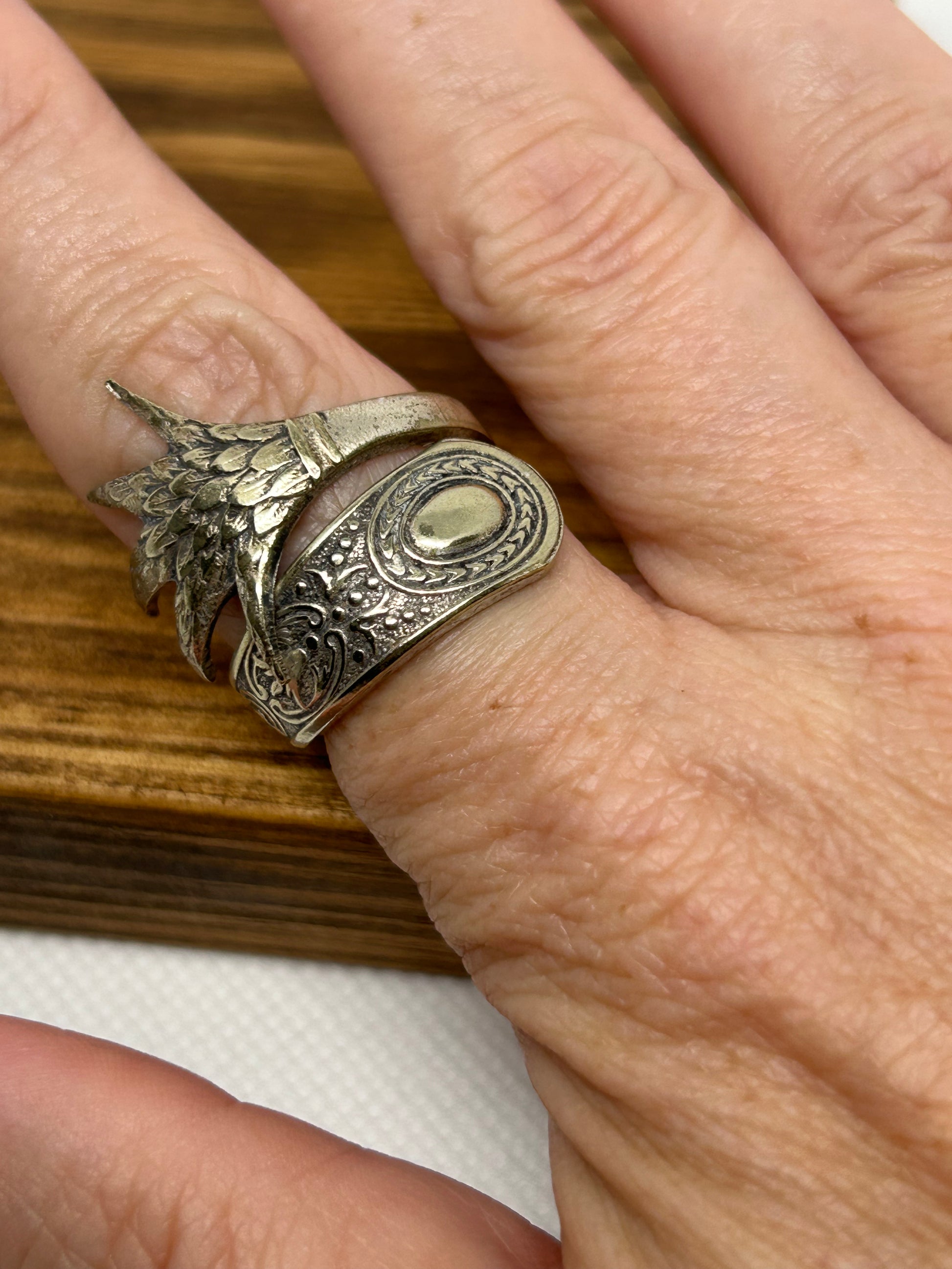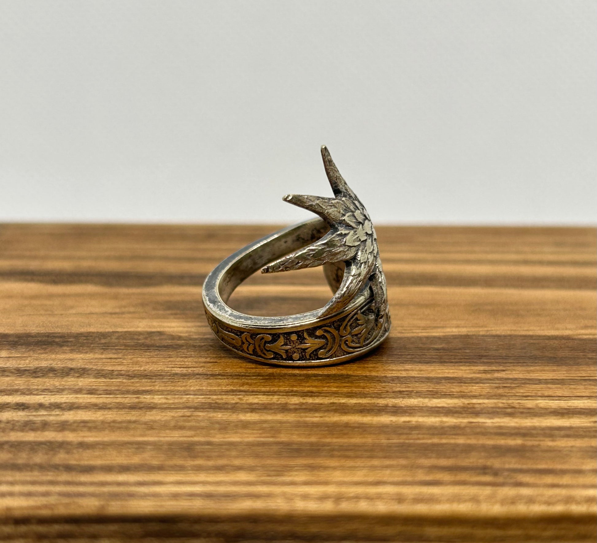 This striking ring has been lovingly handcrafted from an antique pair of silver sugar tongs, giving new life to a piece of history. Featuring a bold feathered motif that gracefully wraps around the finger, paired with ornate filigree and embossed detailing, it’s a perfect blend of vintage charm and modern statement jewelry.